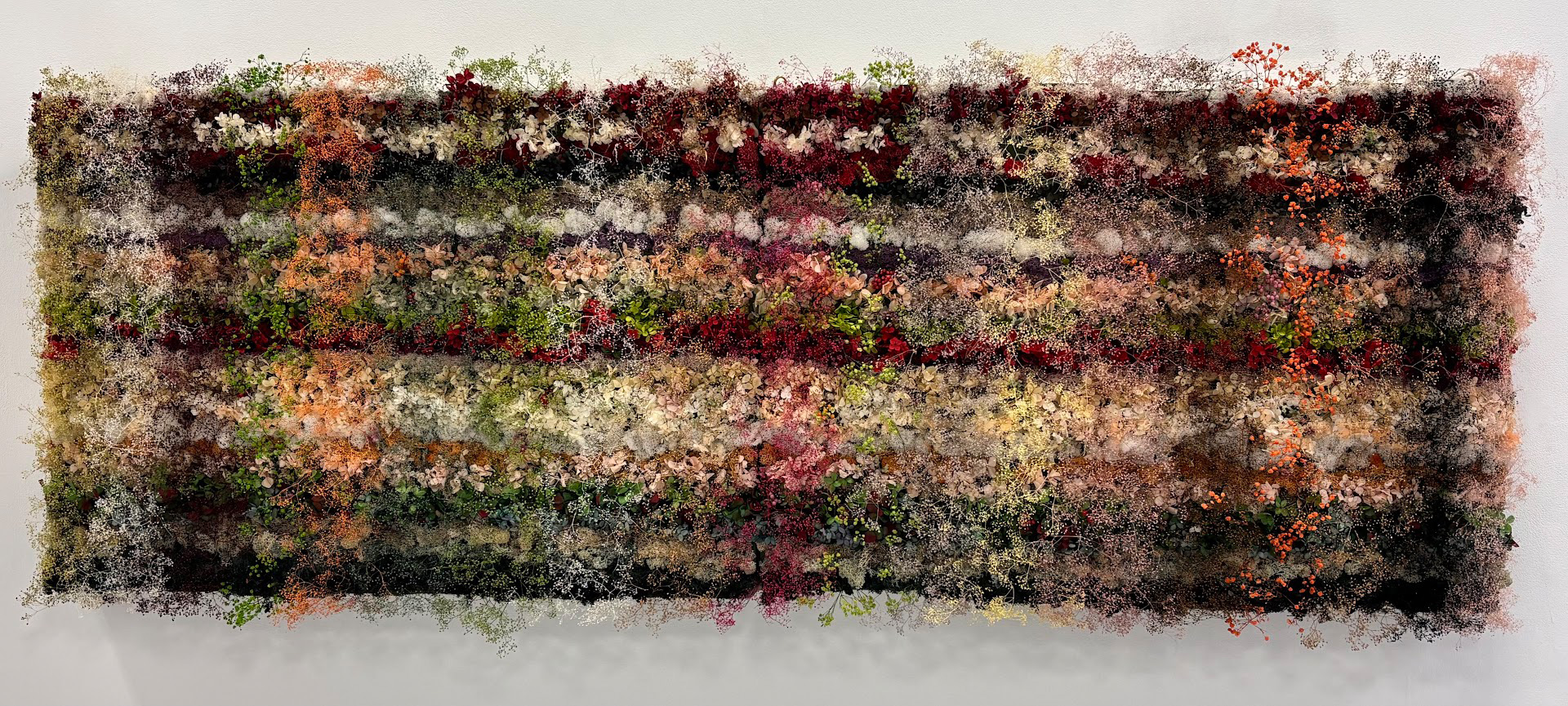 色と色が交差して作られる混色によって何らかの形を作り出すチェックというパターン は、作家として自分が思うに最も「絵画性」を持っているテーマだ。 このような色の交 差を自分が最もこだわる材料であるプリザーブドフラワーを通じて立体的な(空間の) 点描で表現することで、作家としての自分が考える最も「純絵画(ファインアート)」 に近い作業を作ろうとした。