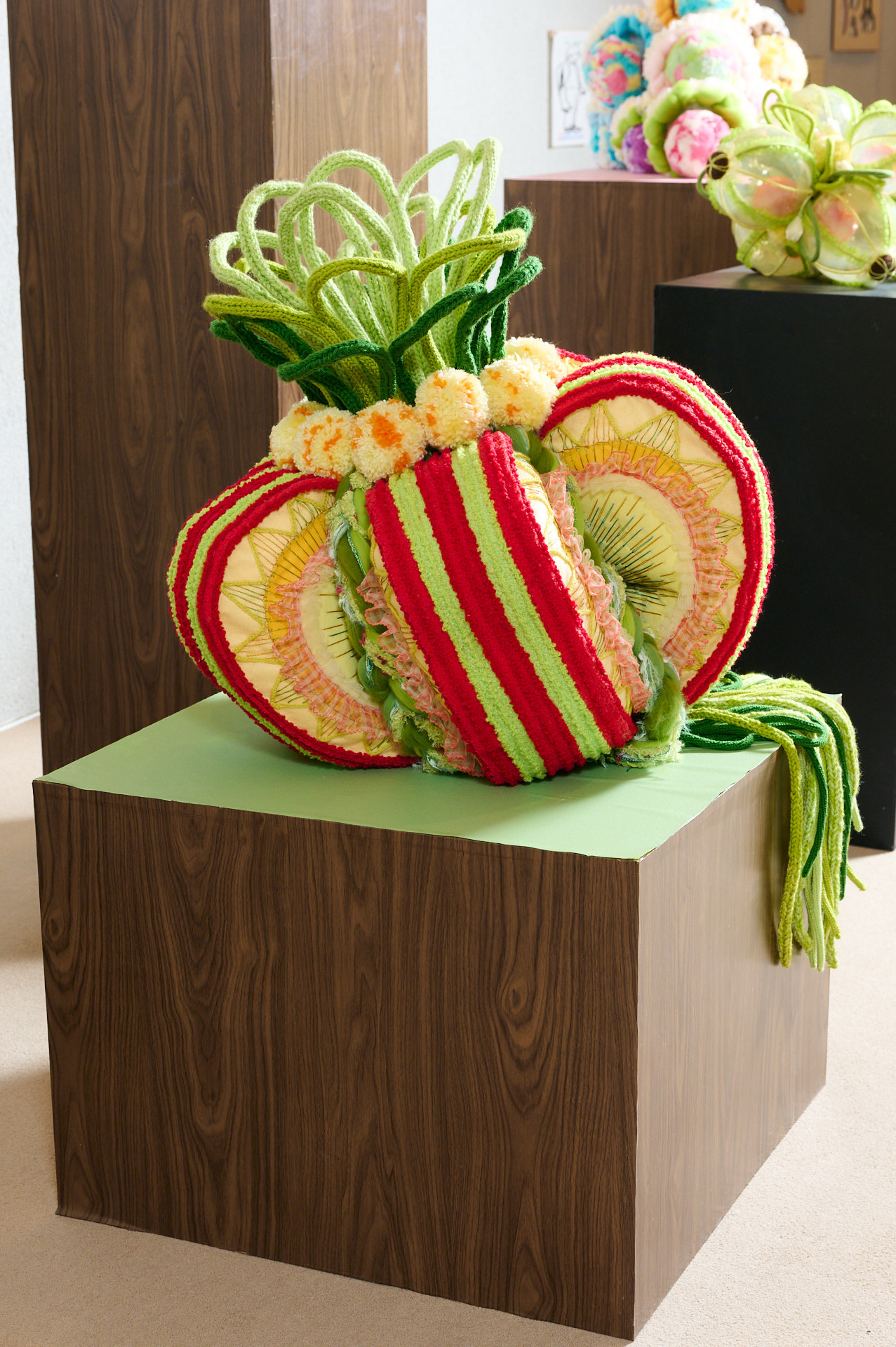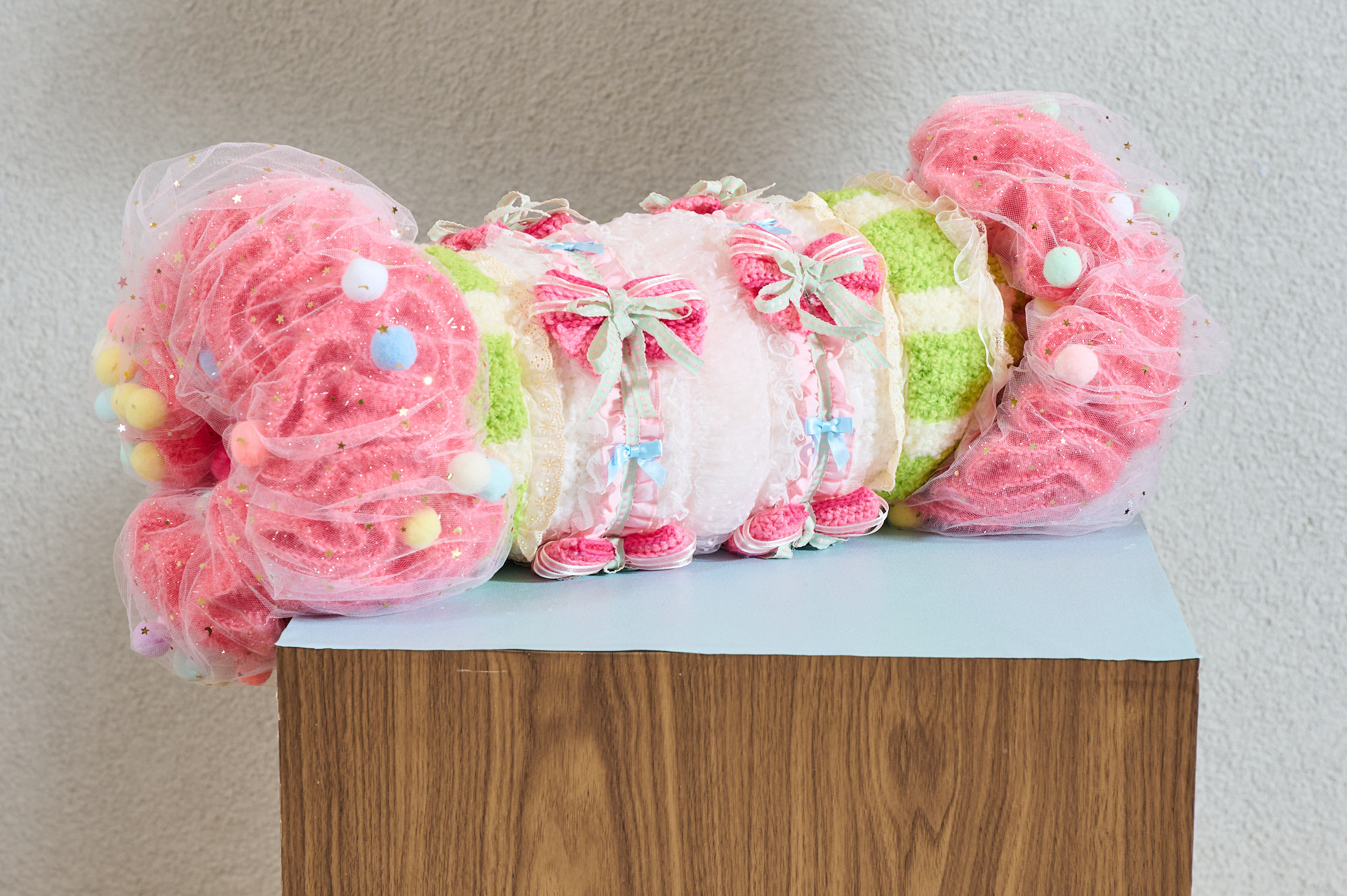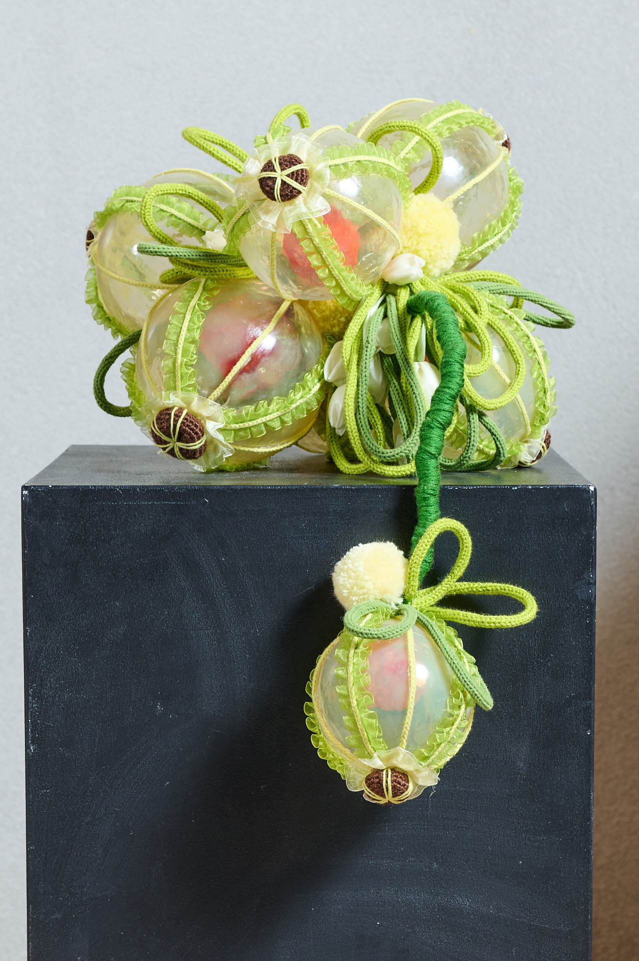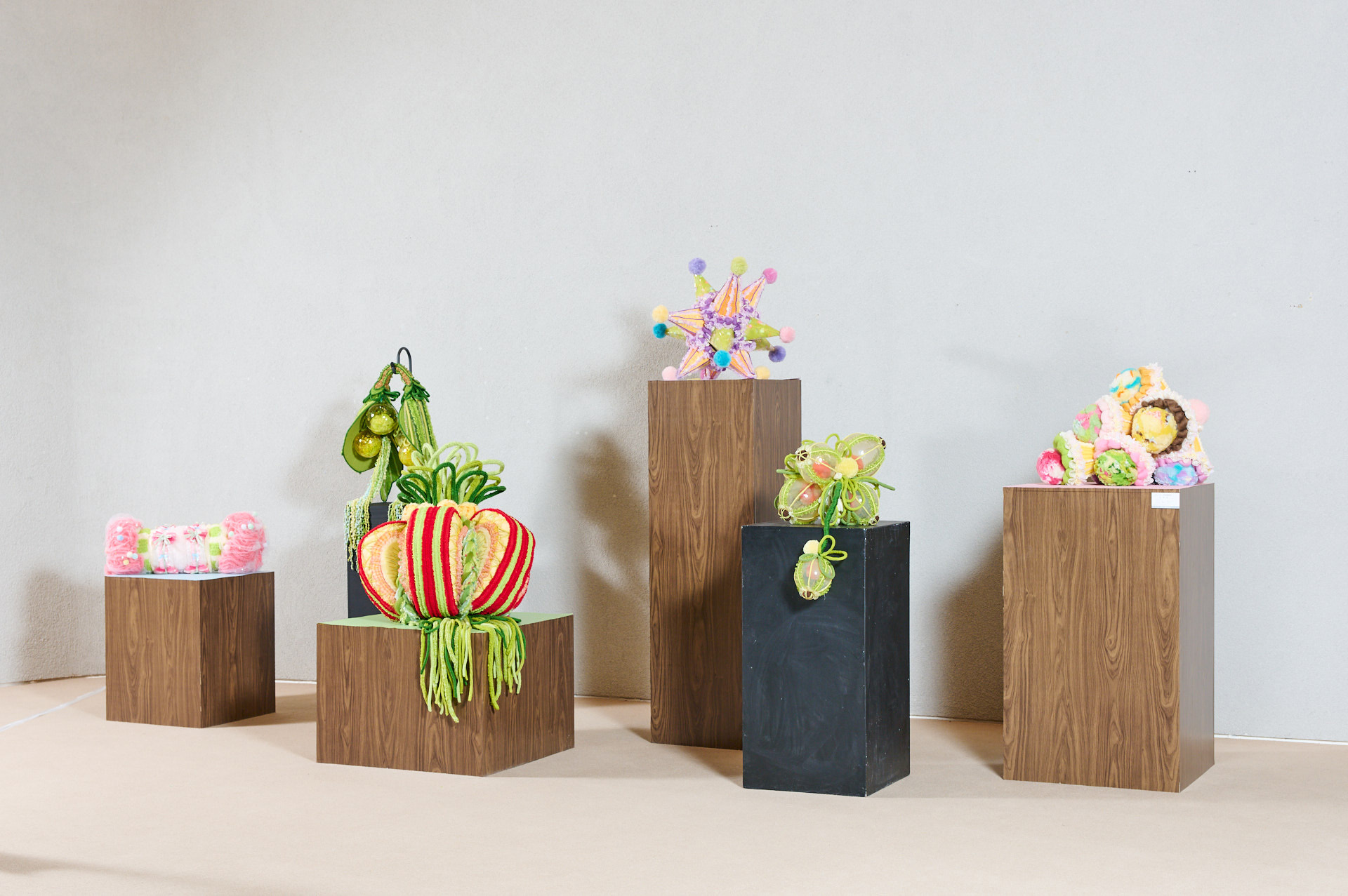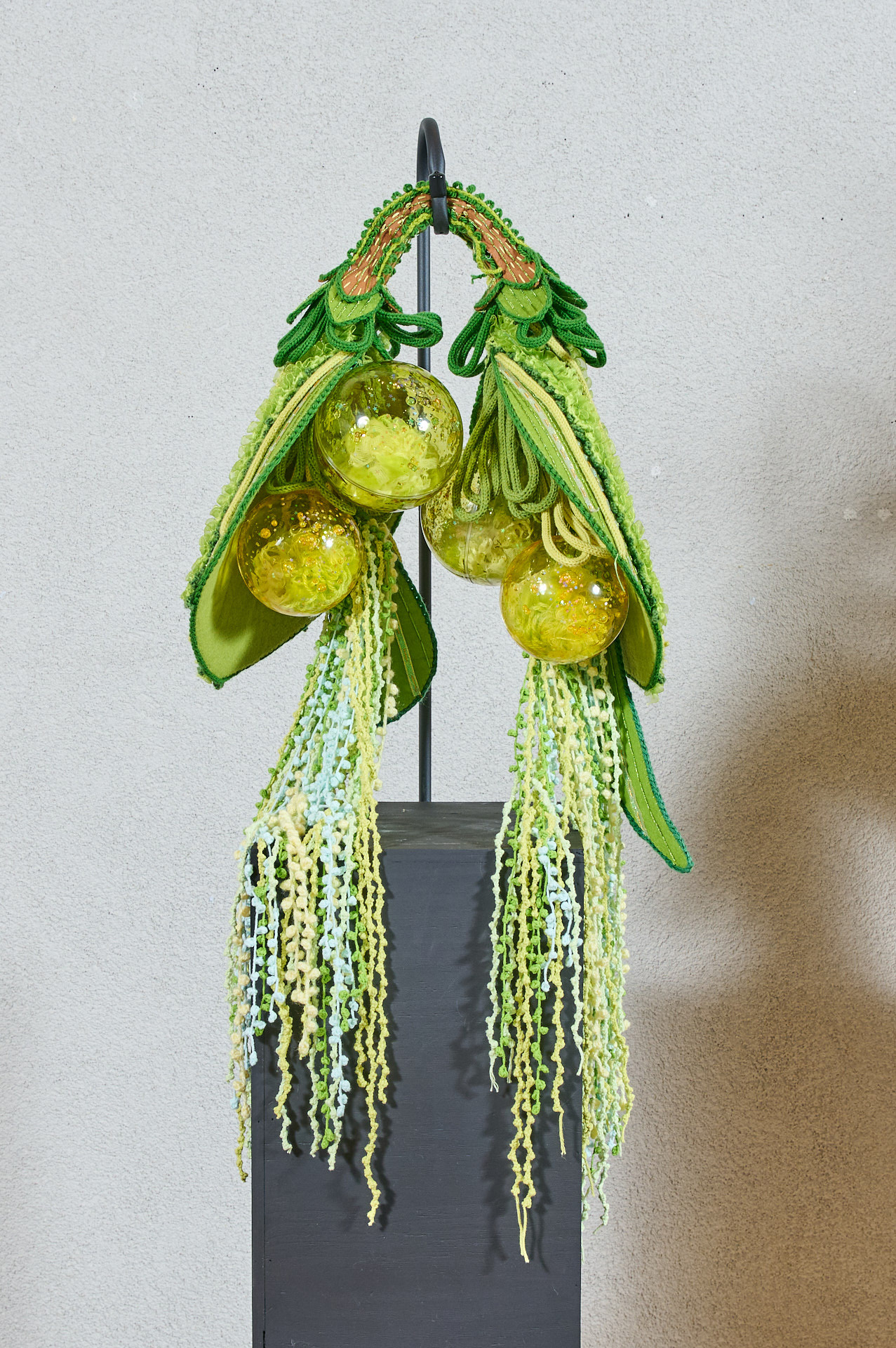 Happy Core美学の影響を受け、毛糸の柔らかさ、布地の質感、アクリルの透明感が空間に共存し、柔らかさと澄明さのあいだにある質感の構造を生み出す。記憶や経験のささやかな断片を素材として再構成することで、形は日常と内面のあいだに静かに凝縮される。光が透過するたびに微細な層や色彩が浮かび上がり、穏やかで柔らかなリズムが生まれる。それぞれの形は内なる光や響きを映す瞬間となり、感覚を通して静かに広がる癒しの空気をつくり出す。短く繊細な感覚が留まり、内面世界にそっと安置される作品である。
