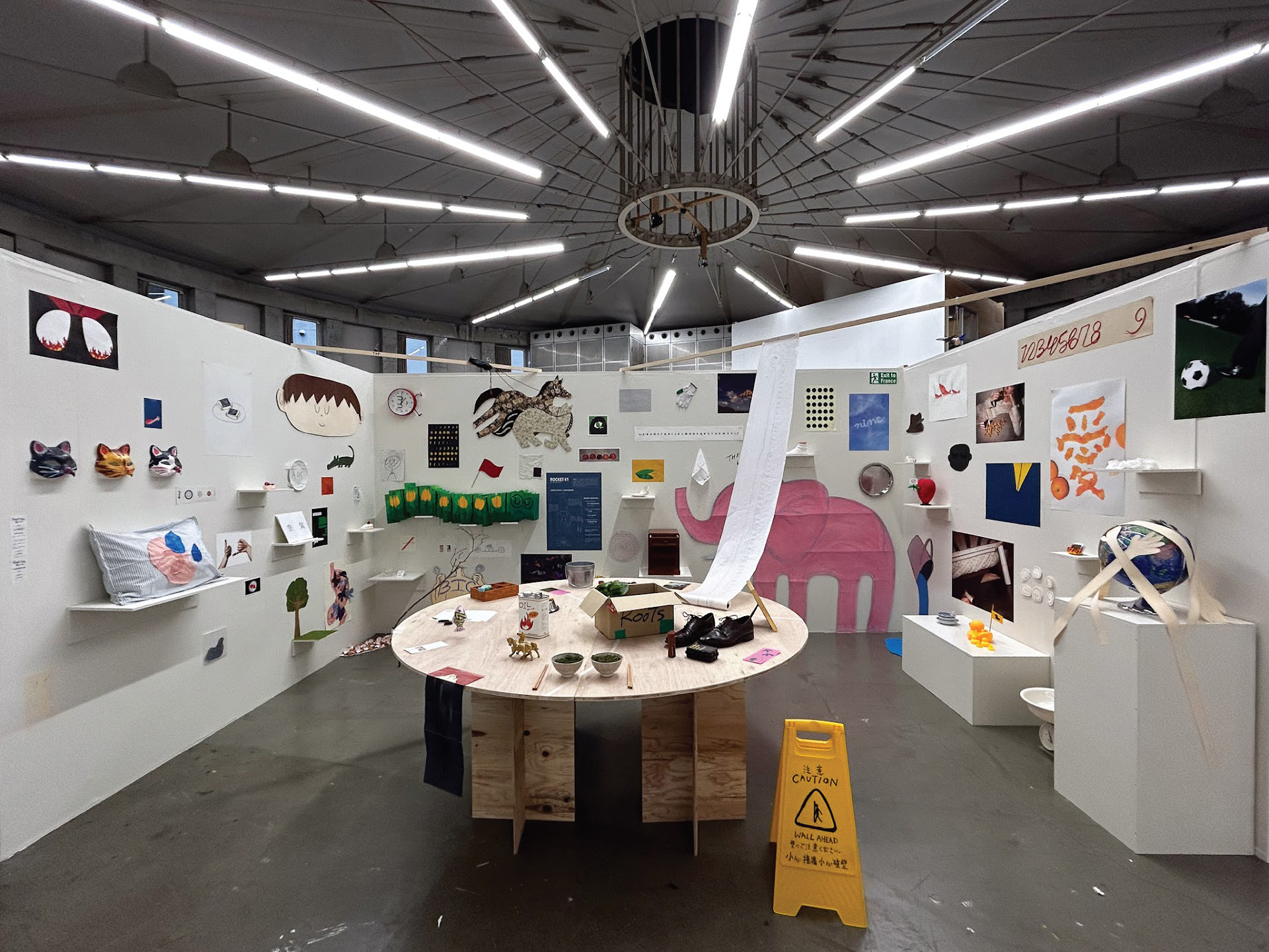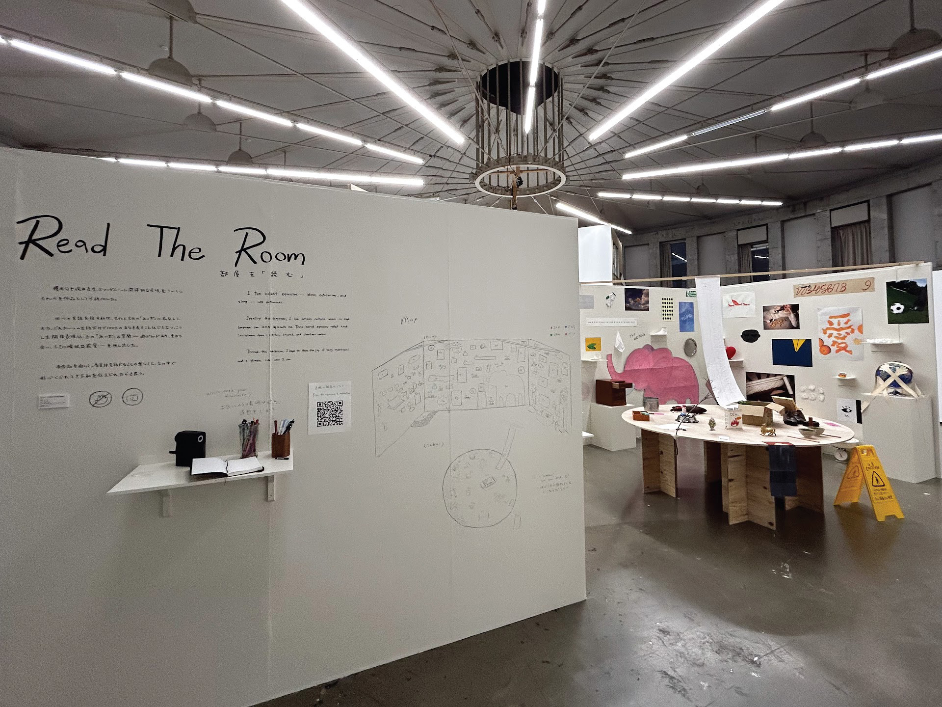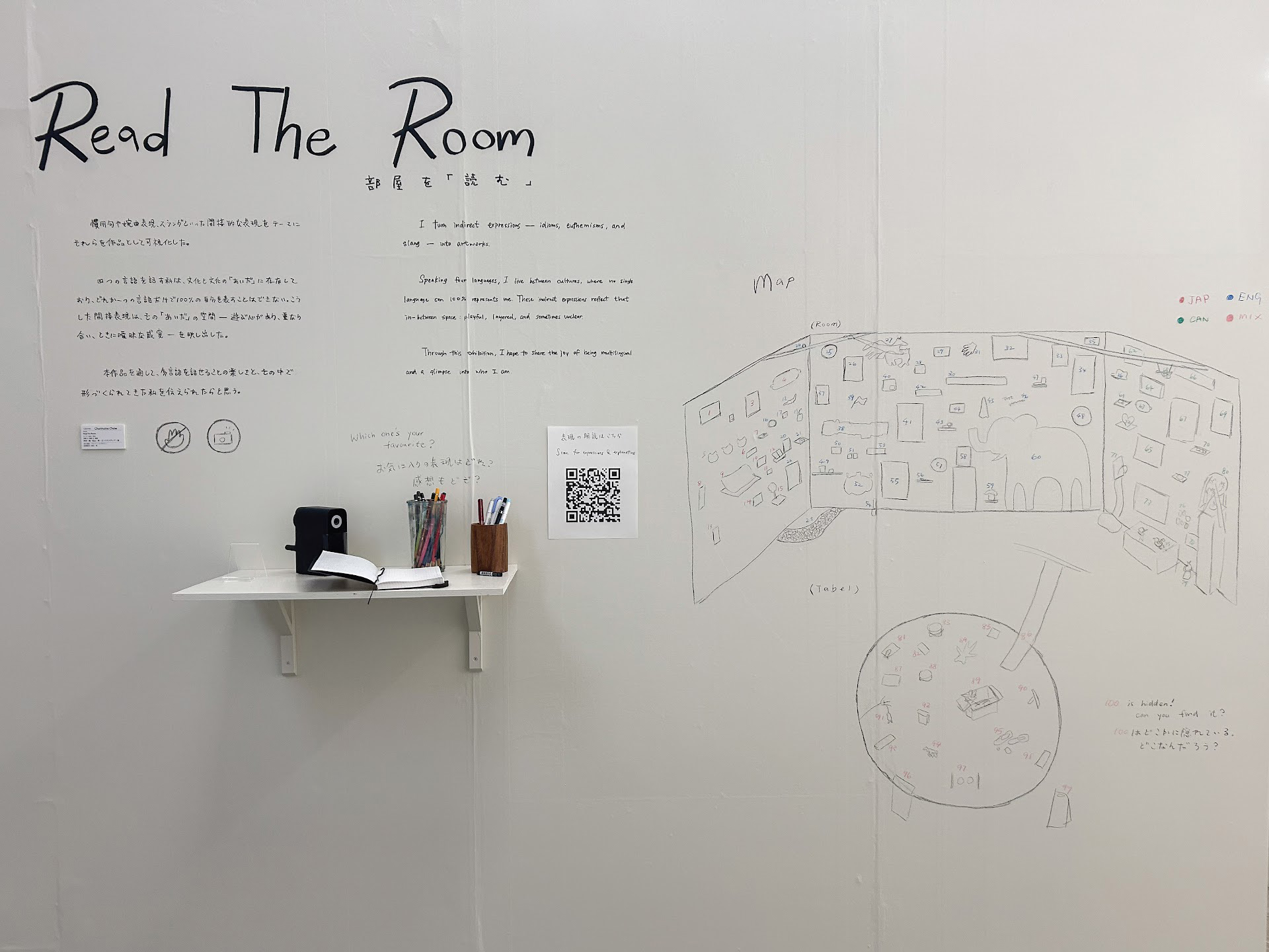 四つの言を話す私は、文化と文化の「あいだ」に在なしており、どれか一つの言話だけで100%の自分を表すことはできない。こうした間接表現は、その「あいだ」の空間一遊び心があり、重なり合い、ときに曖昧な感覚ーを映し出した。