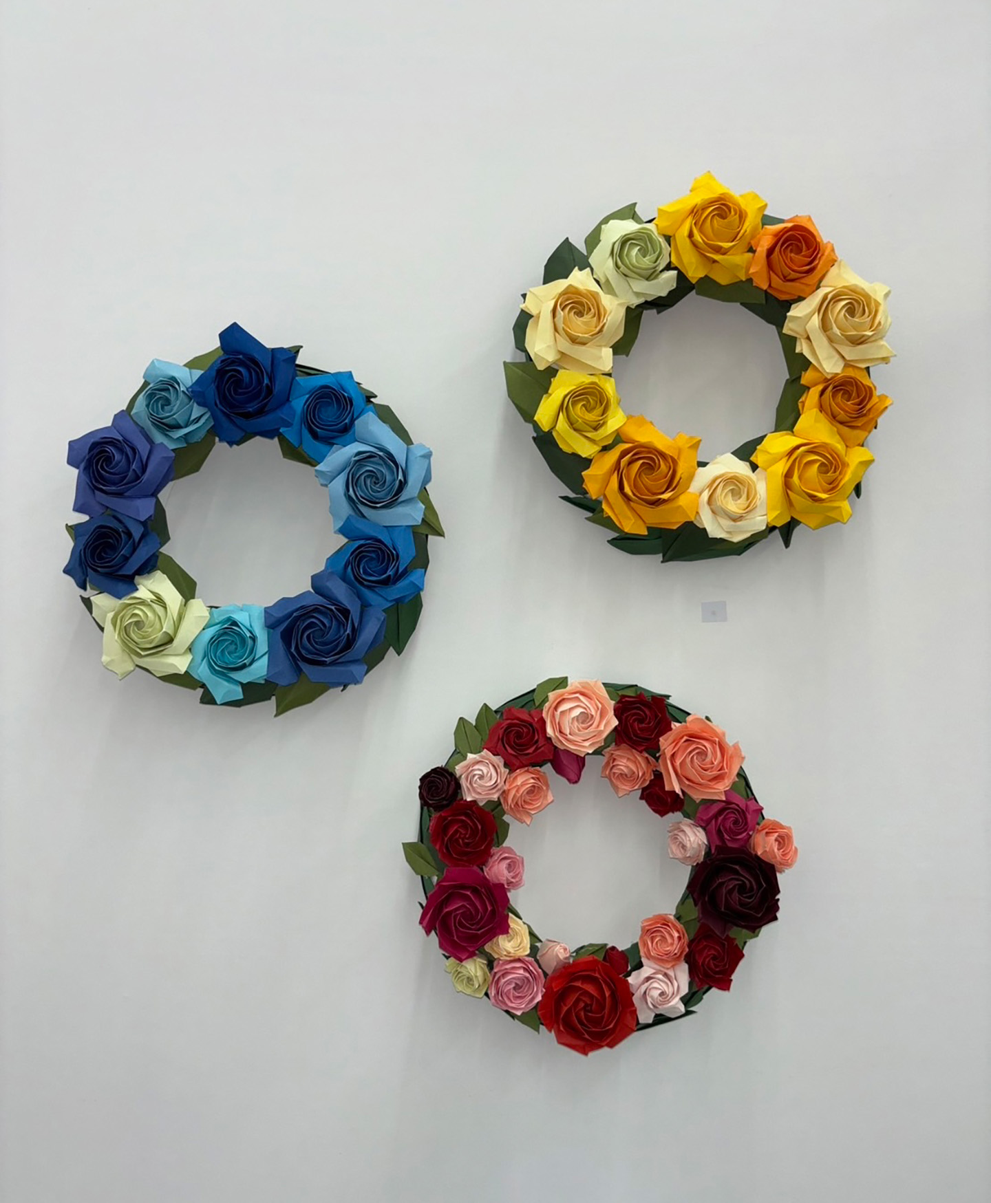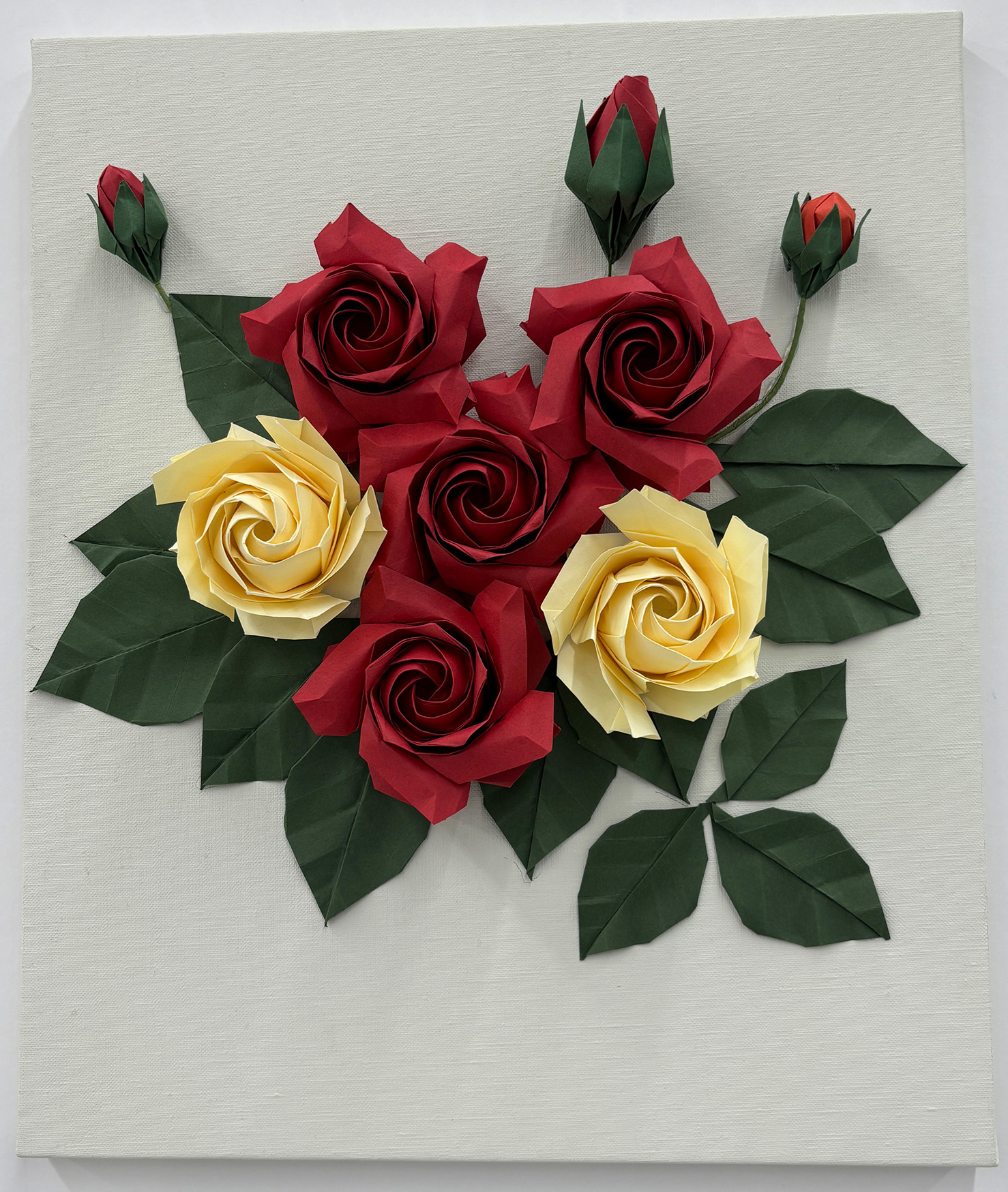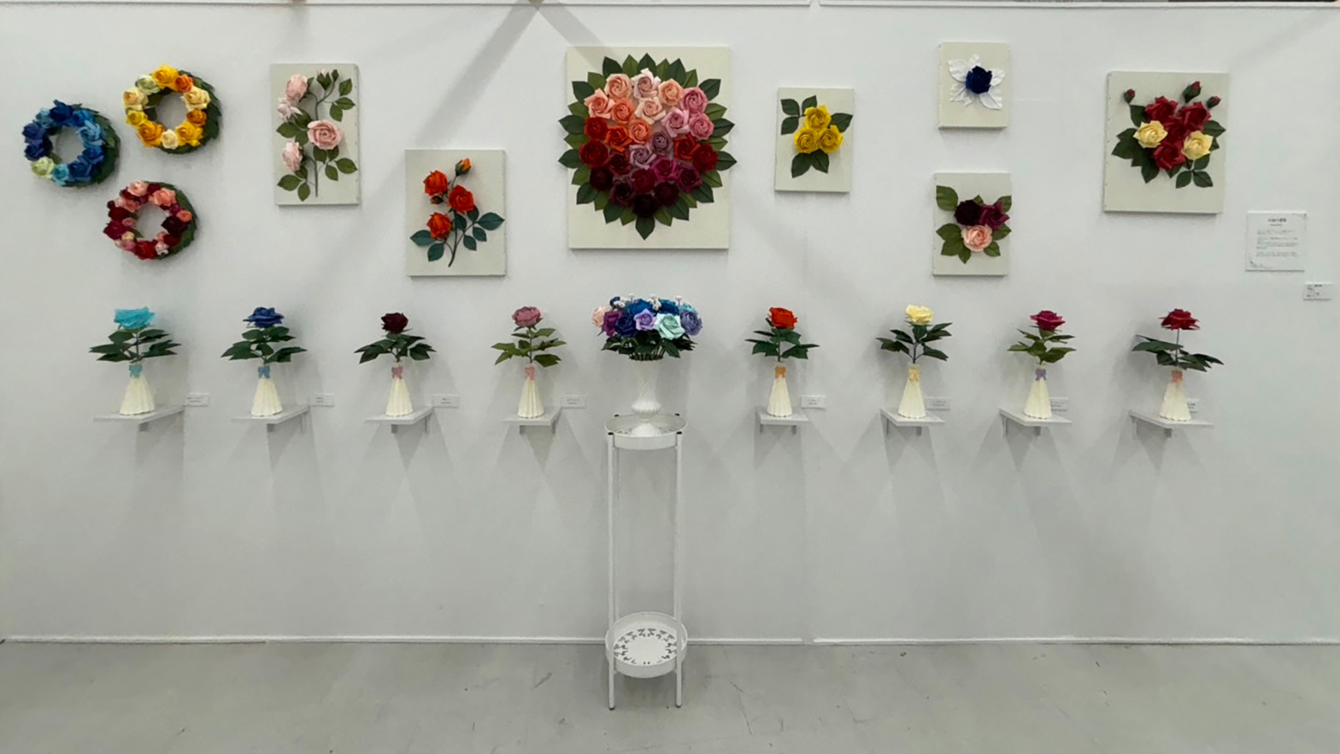 花は美しさと同時に枯れるという時間性を内包している。本物の花は美しいけれどいつかは枯れてしまう。本作品では、紙という身近な素材を用いて枯れることのない薔薇を制作しました。本物の花は一時的な美しさが枯れていく儚さや有限性を感じる一方、折り紙の花は紙という変化しないな素材により、無限に咲き続ける。一枚の紙から、折るという工程を経て一輪の花を造る、その花の美しさを「時間」に抗う形で保存することを試みた。