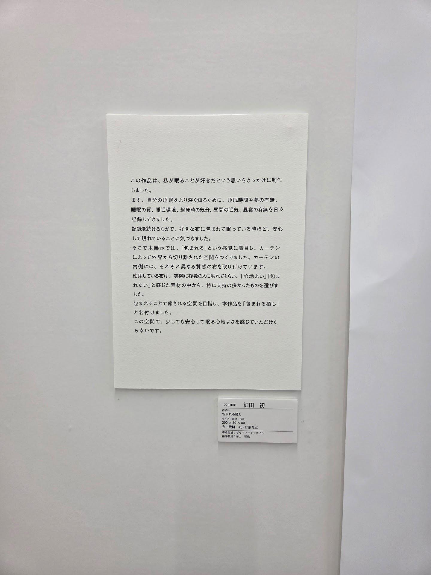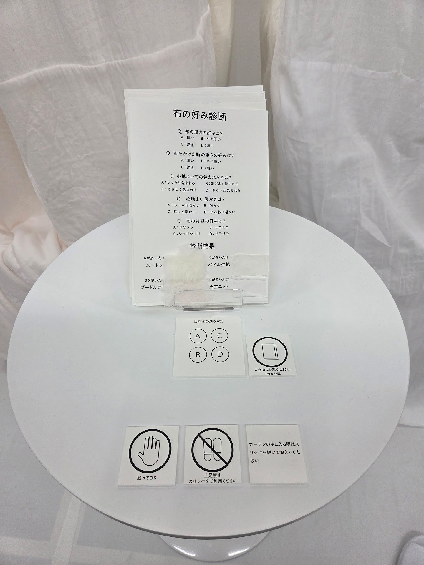 睡眠に関する展示です。 本展示では、異なる質感の布に触れながら包まれることで、自分にとっての心地よさを感じることができます。