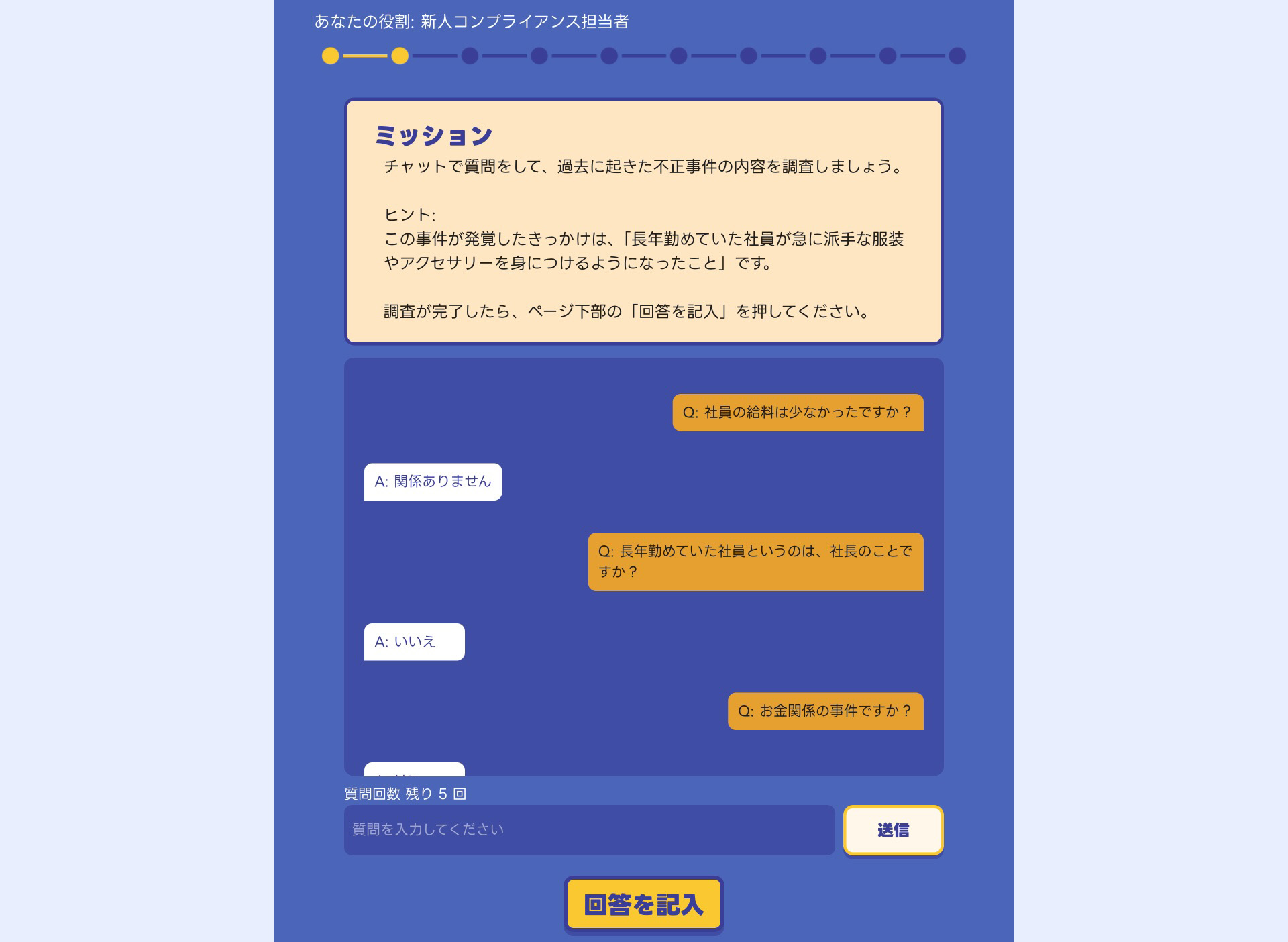 本研究では、2人1組でプレイする全2部構成の対話型思考ゲームの制作を行った。ゲームはとある会社を舞台としており、会社内で起きた不正に関するお題が出される。プレイヤーは「どのような不正が行われたのか」から「どうすれば防げるのか」の考察を通じて、組織内のルール設計を体験することができる。