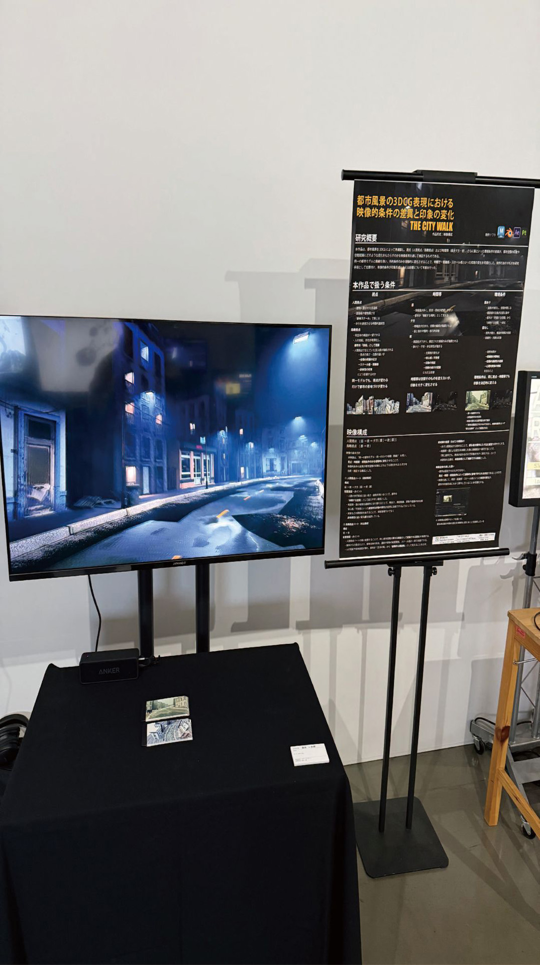 本作品は、都市風景を3DCGによって再構築し、視点および時間帯、さらに霧といった環境条件の差異が、都市空間の印象や空間認識にどのような変化をもたらすのかを映像表現を通して検証するもので、制作行為そのものを研究手段として位置付け、映像的条件が印象形成に与える影響について考察を行った。