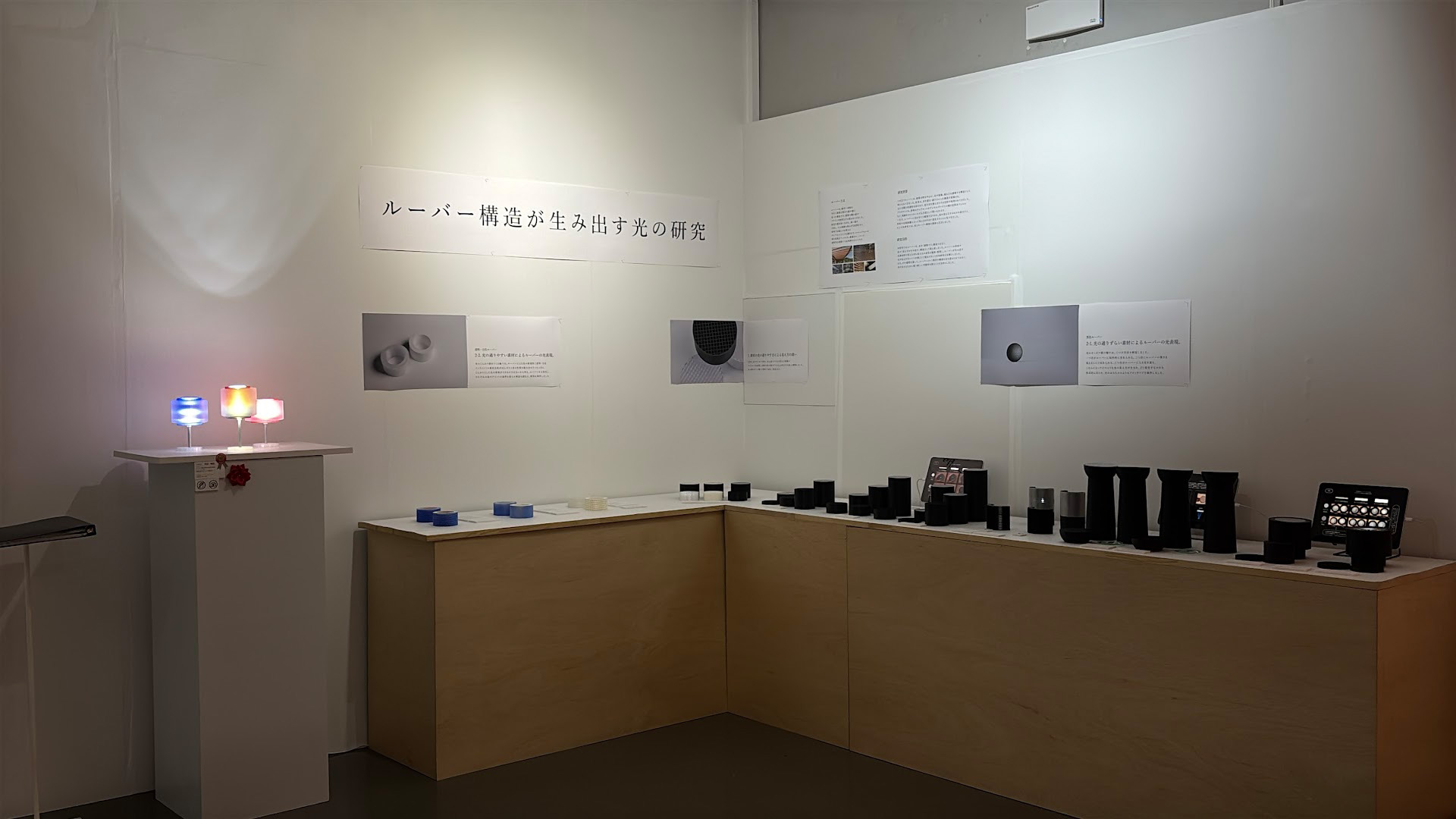 『光や風、視線を調整する構造』として使われてきたルーバーを『光の見え方を生み出す構造』として捉え直しました。ルーバーの素材や形状、光源条件などを変えながら見え方の変化を観察・整理し、その結果を展示しました。その過程を通じて、 ルーバーという既存の構造を光を調整ためだけではなく、光を見せるために使う新しい可能性を探っていきました。