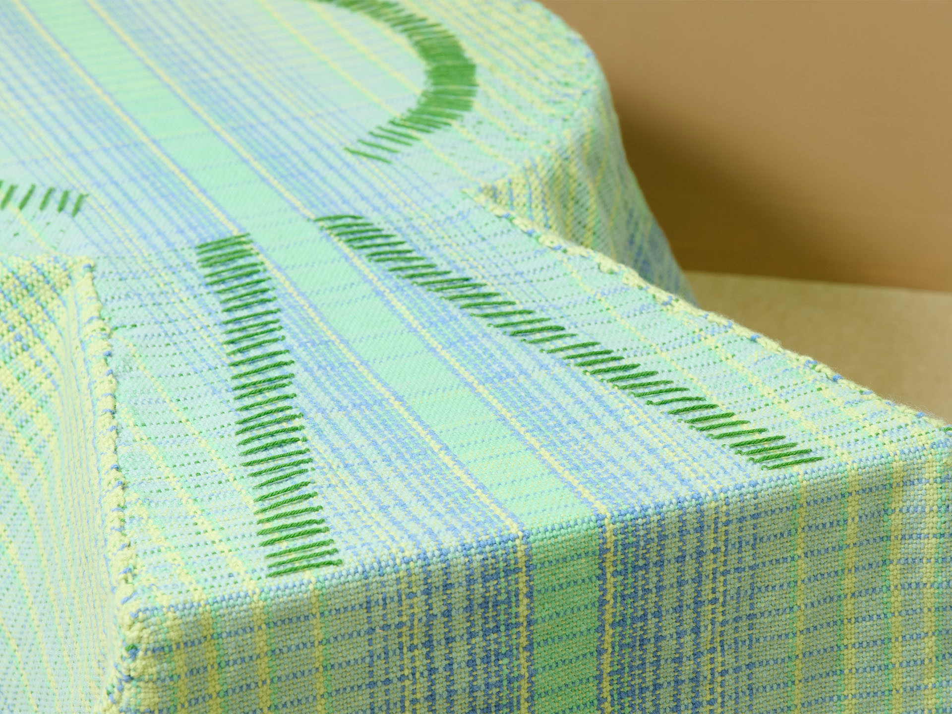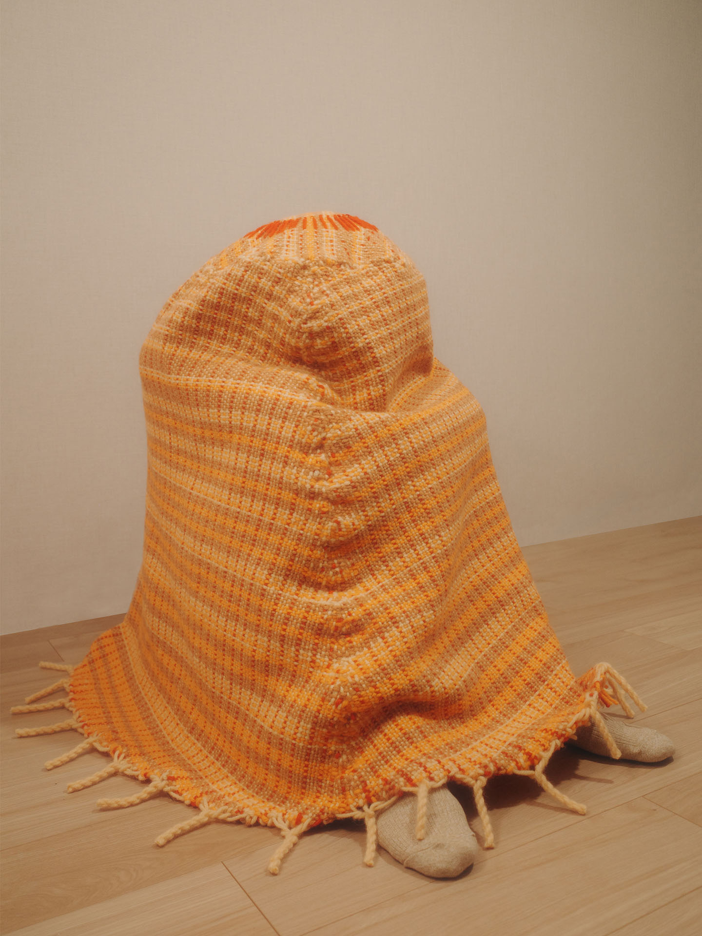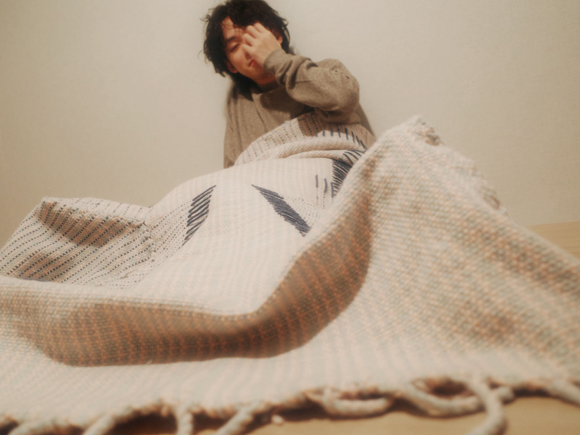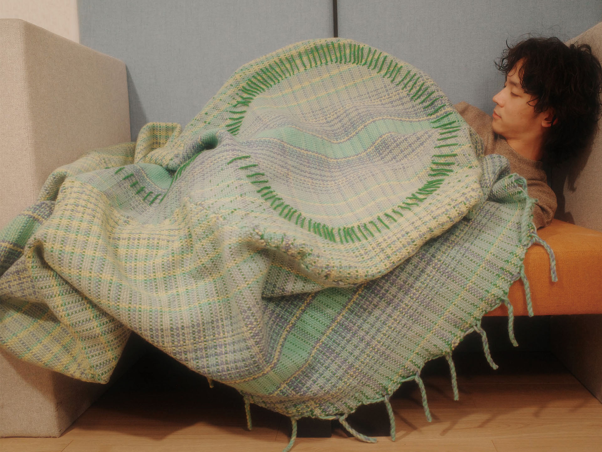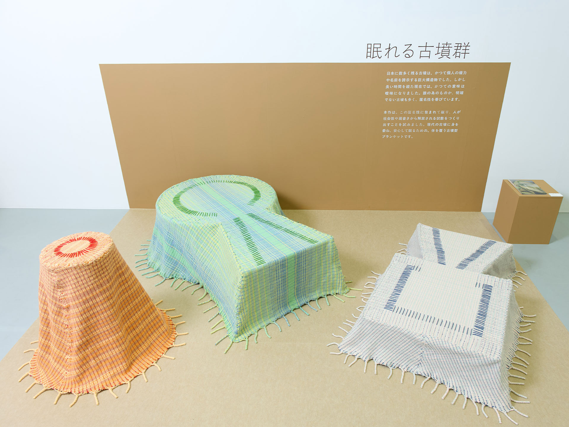 本作は、この匿名性に包まれて眠り、人が社会性や肩書きから解放される状態をつくり出すことを試みました。現代の古墳に身を委ね、安心して眠るための、体を覆う古墳型ブランケットです。