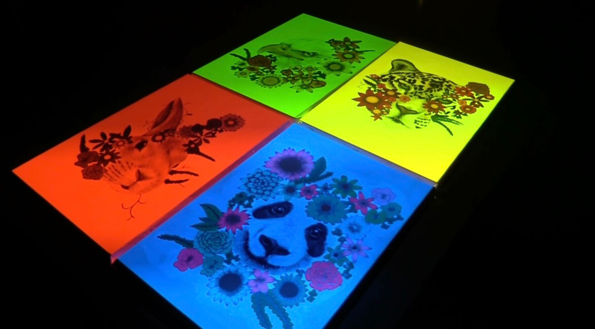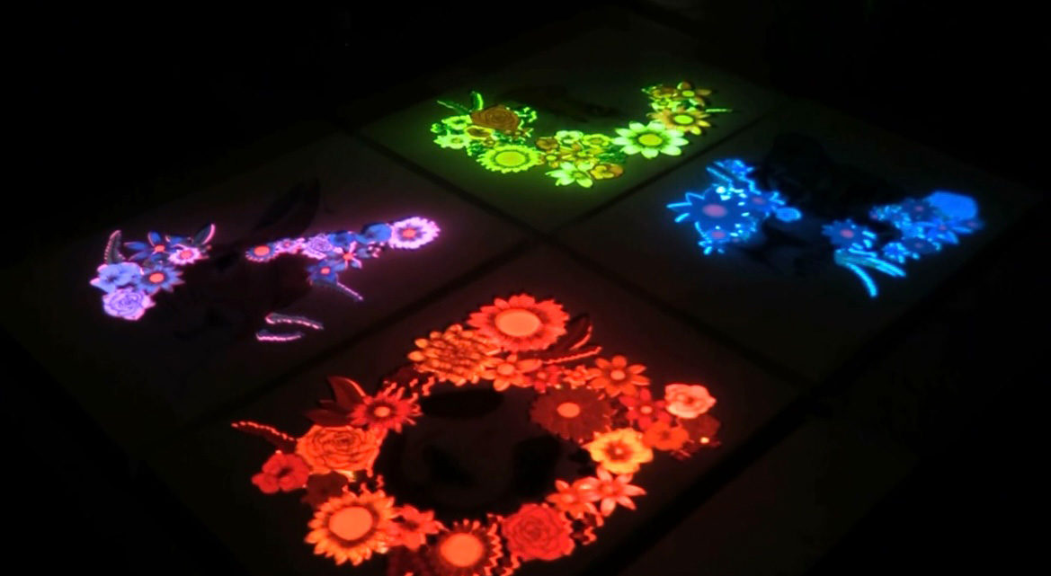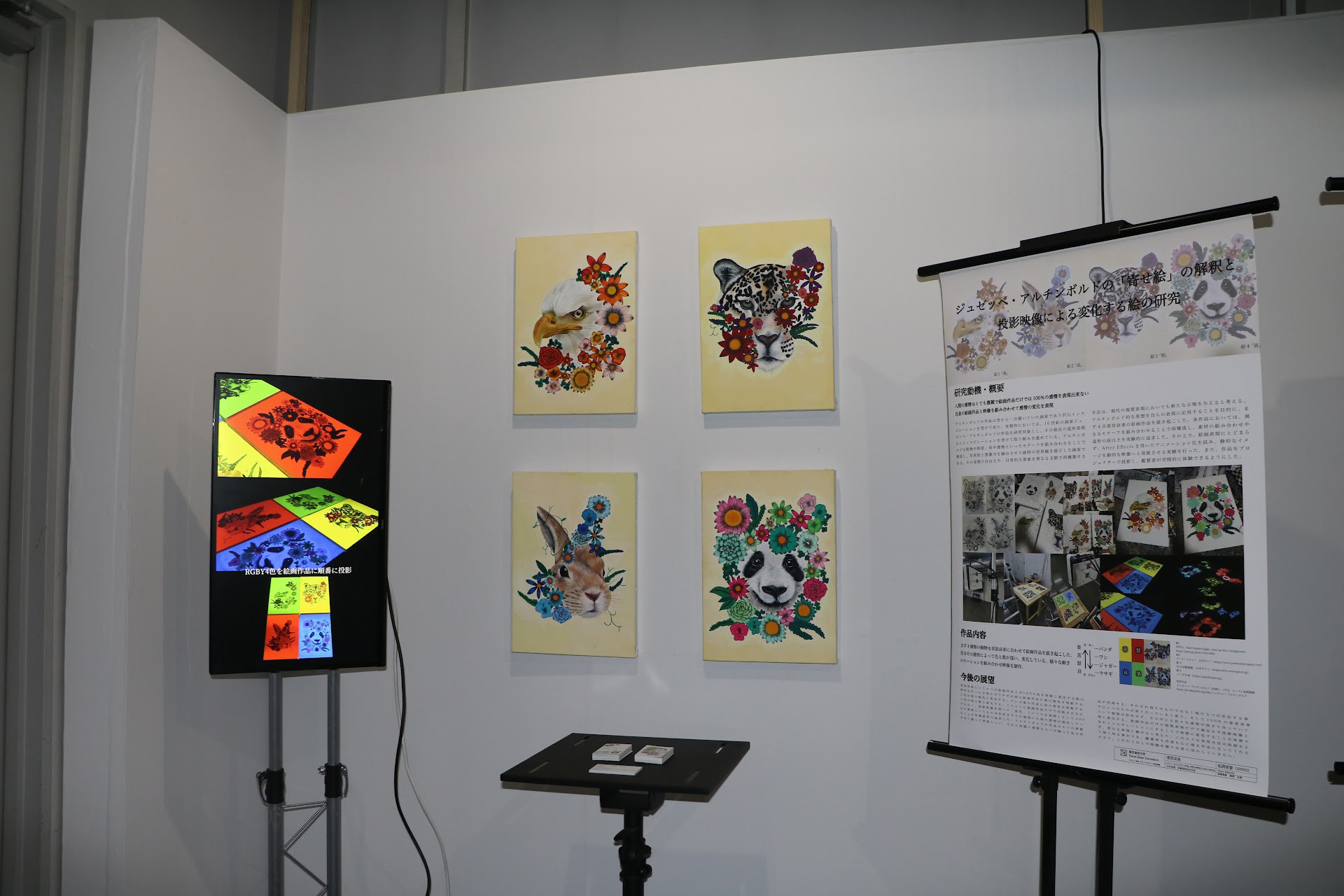 感情は絵画だけでは十分に表せないと考え、自身の絵画と映像投影を組み合わせて変化を表現した。アルチンボルド的発想を応用。ワシ:喜、ジャガー:怒、ウサギ:哀、パンダ:楽、R:怒、B:青、G:楽、Y:喜を設定。色の投影で花が別の感情色へ変化し、花部分のみをマッピングして感情の移ろいを可視化した。人間の感情は複雑で100%の感情は存在せず、色々な感情が混ざり合う事で「感情」は成立する。