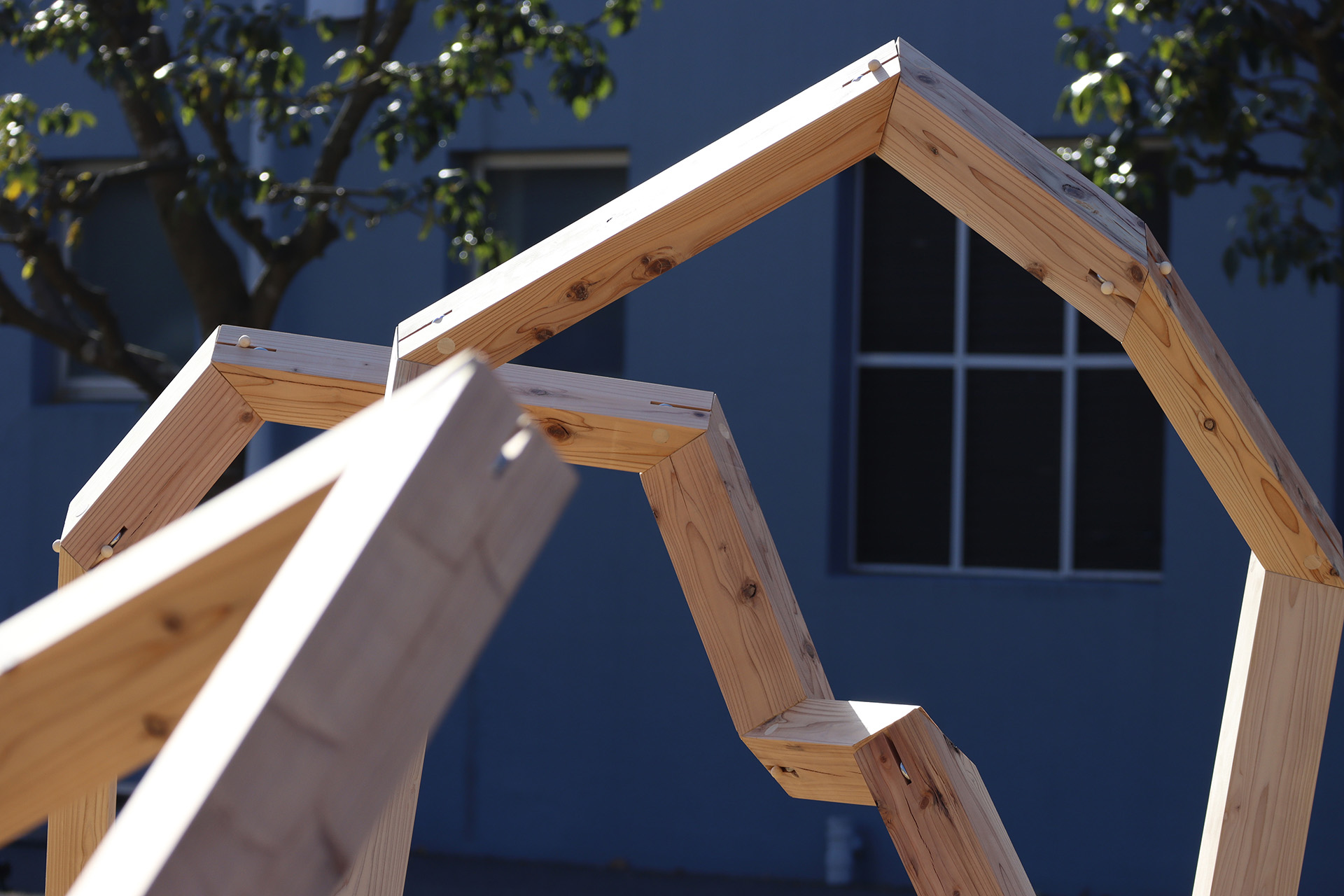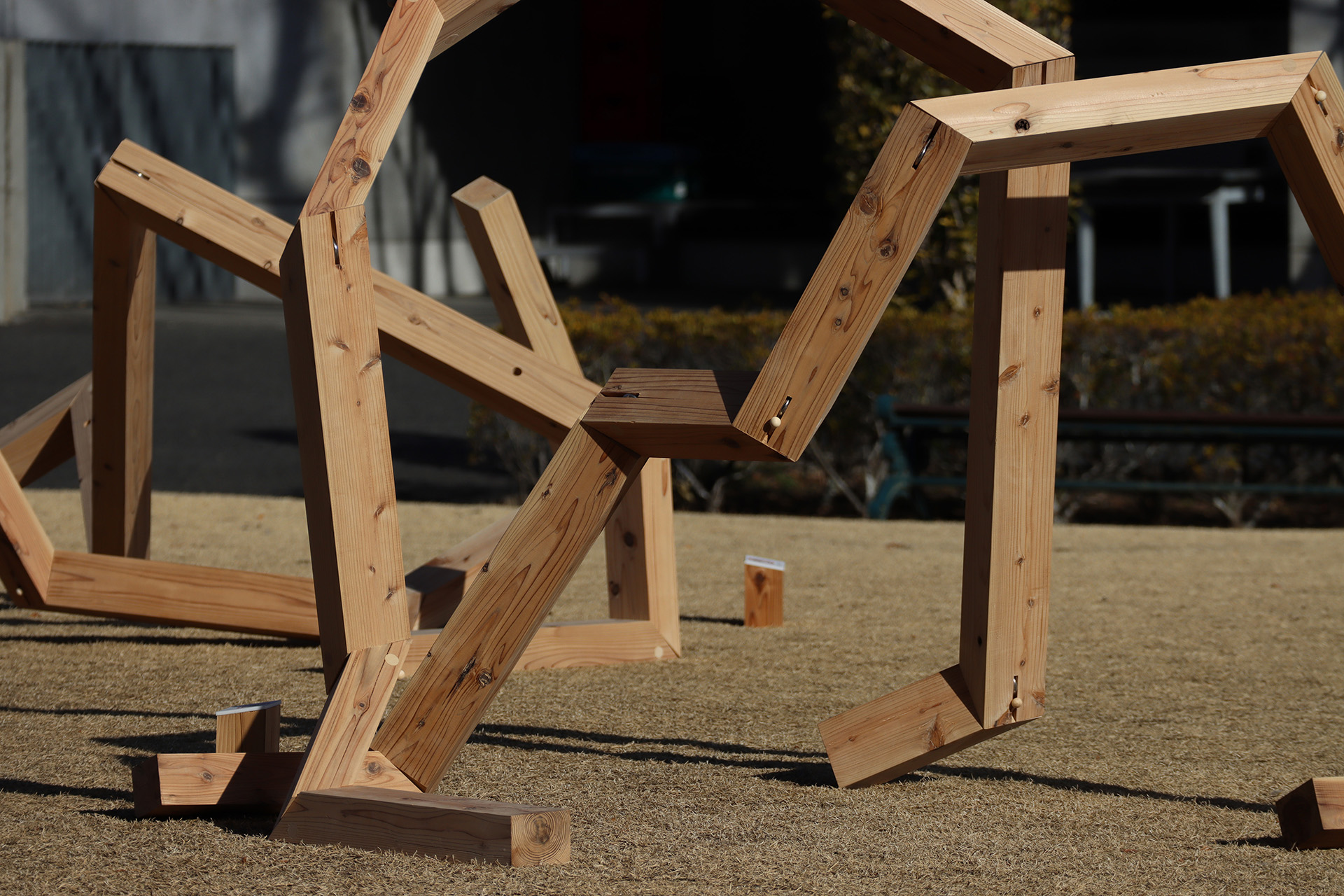 本研究は、構造の枠に留まっていた角材を解放し、その魅力を空間へと広げる試みである。「角材らしさ」を損なうことなく、幾何学的な操作によって「動き」を与えることで、静止していた木材に自由を与え、角材の新たな可能性を提案する。